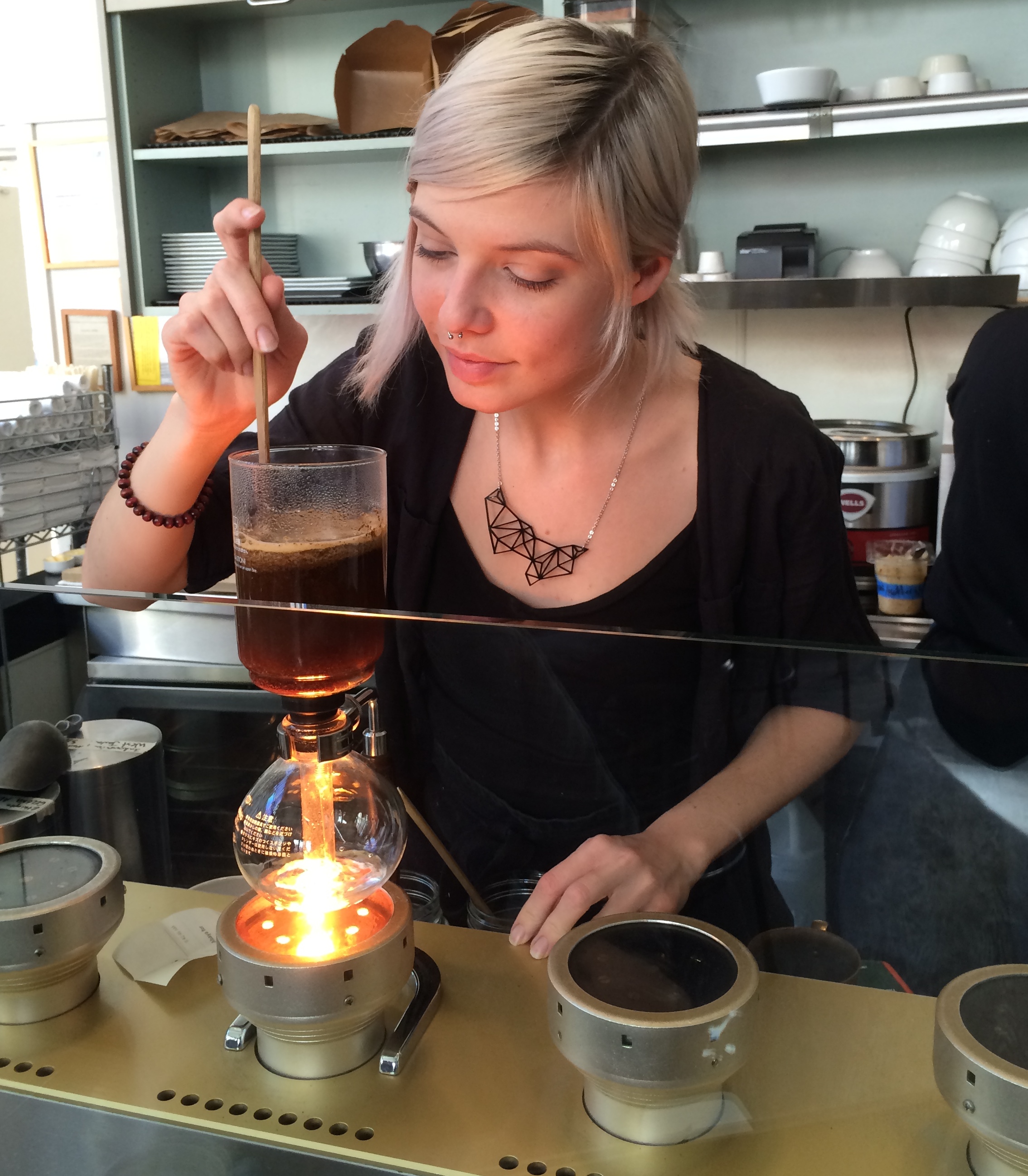 Only this time, Elliott ordered his coffee siphon-style. Its a delicate and elaborate brewing method that uses an incandescent light bulb, patience, and a chemistry class-like contraption.