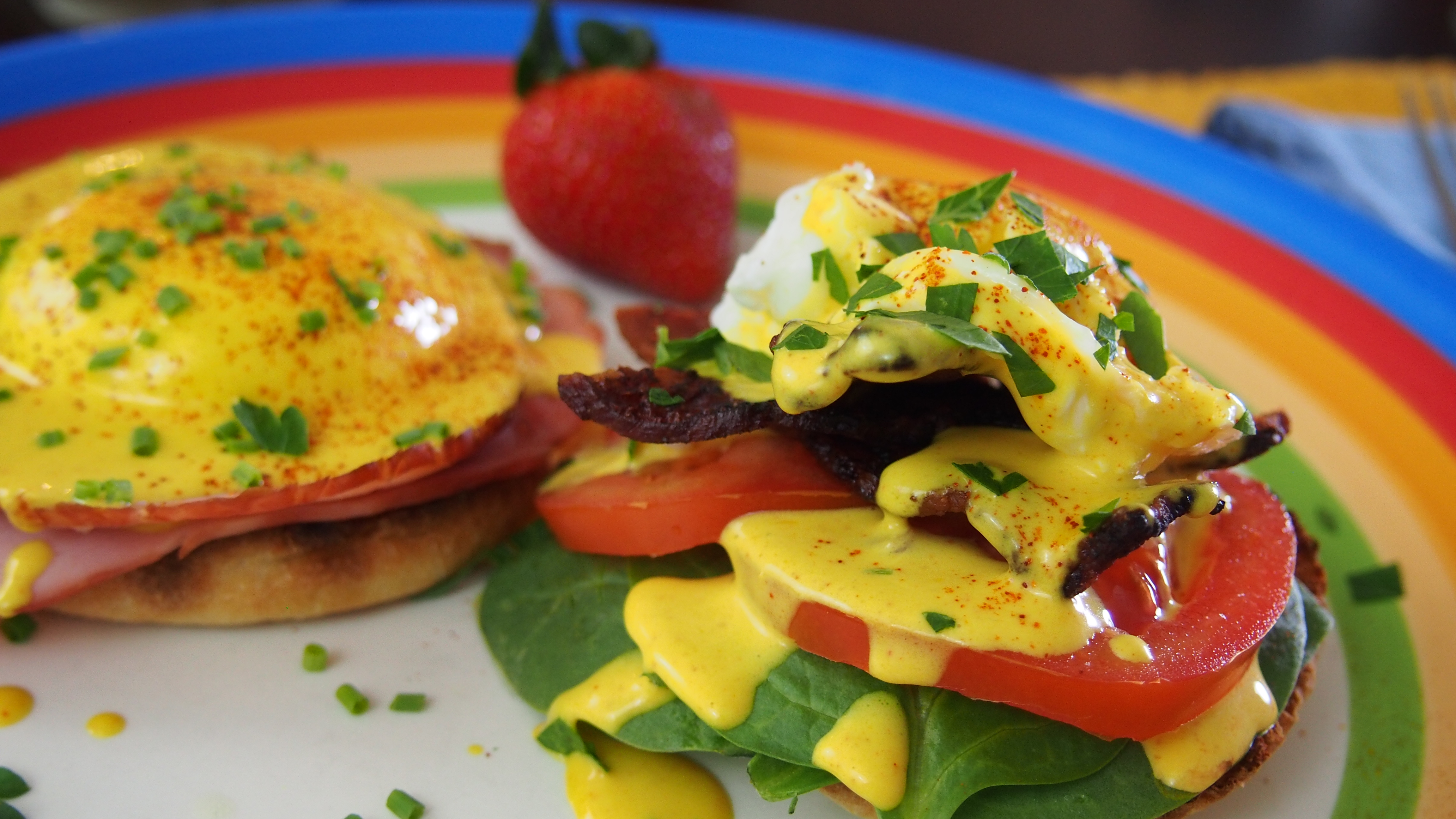 There's a reason why people tend to order Eggs Benedict when they eat out. The eggs need to be cooked to order, the hollandaise is finicky, and all of the other ingredients need to be timed perfectly for everything to be served warm. I personally vowed to never make it again for a group after one holiday breakfast with my family. When we finally sat down to eat after what seemed a whirlwind cooking session, my brother pointed out he still had an empty plate. Whoops! Since this was the weekend to reintroduce eggs back into my diet, I decided to indulge in this decadent breakfast that used to be my Saturday morning standard. While researching recipes for hollandaise sauce, I discovered to my horror that the primary ingredient is egg yolk. For years I was ordering my eggs poached hard just for the ability to cut out the yolk, and here I was eating it all along in the sauce! Feeling strengthened from my diet, I was determined to find an yolk-less alternative to the classic hollandaise. Elliott wasn't quite as excited, but he agreed to play along in what eventually became the "Battle of the Benedicts." Little did we know that after sleeping-in and embarking on what became a two hour cooking adventure, it would turn into the "Battle of the Low Blood Sugars!" See below to see which sauce came out on top! Classic Hollandaise, courtesy of Tyler Florence. Elliott's Egg-Less Hollandaise 1/2 cup cream 1/4 tsp. powdered mustard Pinch of cayenne Pinch of paprika Sprinkling of turmeric, for color Salt, to taste 2 tsp. of lemon juice In a sauce pan, simmer the cream and spices over the lowest heat setting for 10-15 minutes, stirring at least every minute, until thickened to desired consistency. If it gets too thick, add a spoonful of water. Take the sauce off the heat and let rest for a minute or two. Add the lemon juice and stir to combine. We decided to go for two different versions on one plate: One 'classic,' with smoked ham and chives, and the other a 'BST', with bacon, spinach, and tomato. Though Elliott loved the creaminess of the classic sauce, he did say that the egg-less version was just as tasty and much easier to make. Mwahaha.... [caption id="attachment_1832" align="alignleft" width="300"]