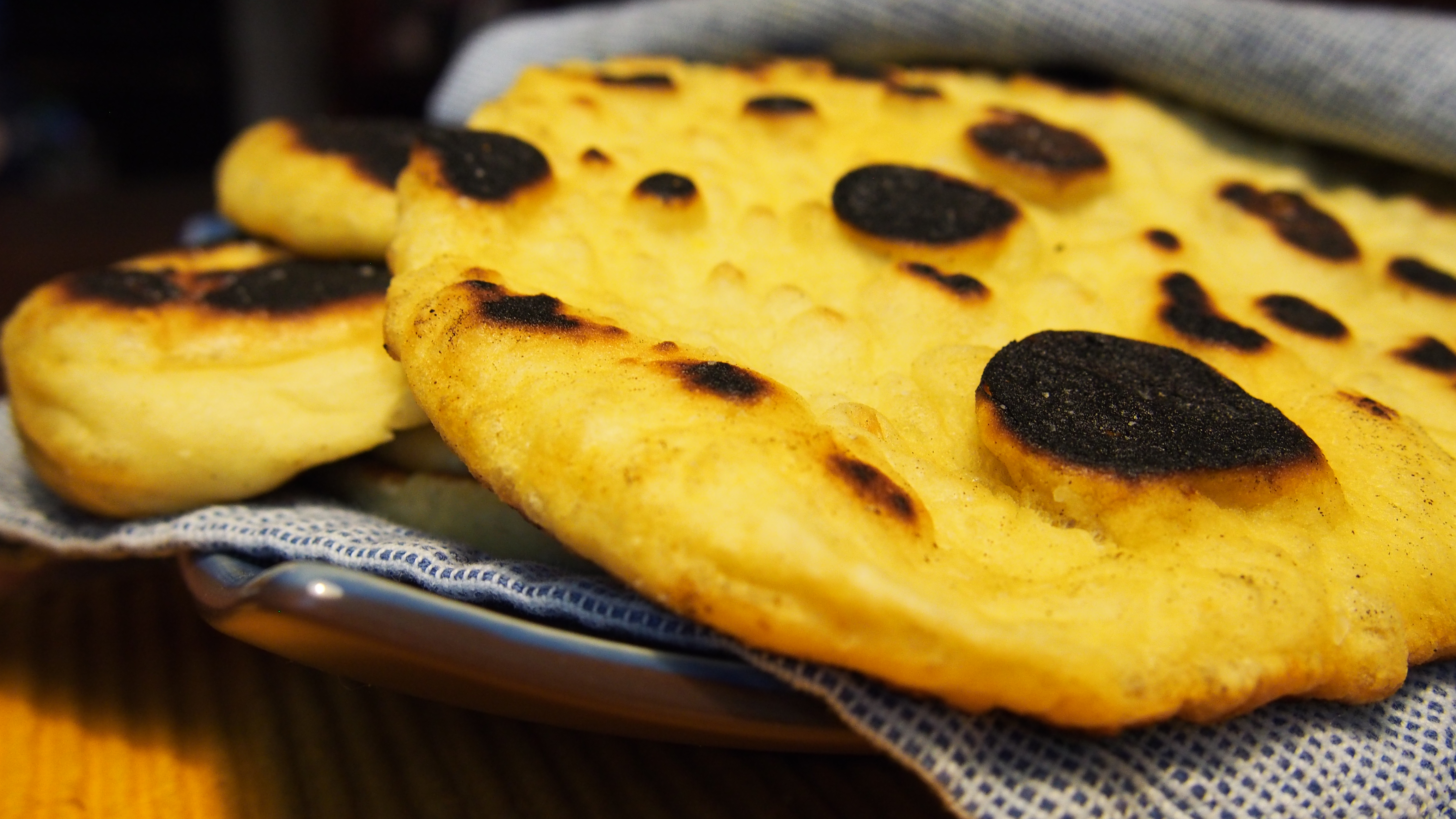 The middle of winter is here and so is our appetite for hot, spicy meals. Our go-to neighborhood Indian restaurant closed its doors recently, so we decided to take measures into our own hands. Based on our novice-level experience with cooking Indian cuisine, we relied on the internet for inspiration and settled on butter chicken and naan. Both recipes were delicious but the naan was the real surprise. As you can see from the photograph, our cast iron skillet gave our naan the perfect amount of char without overpowering it. And it was just as delicious the next day after a quick re-heat in the toaster! If you're bad like us, you'll brush the naan with a little butter and a sprinkle of salt. We are willing to bet that after you make this recipe, you'll never buy the store-bought version again!