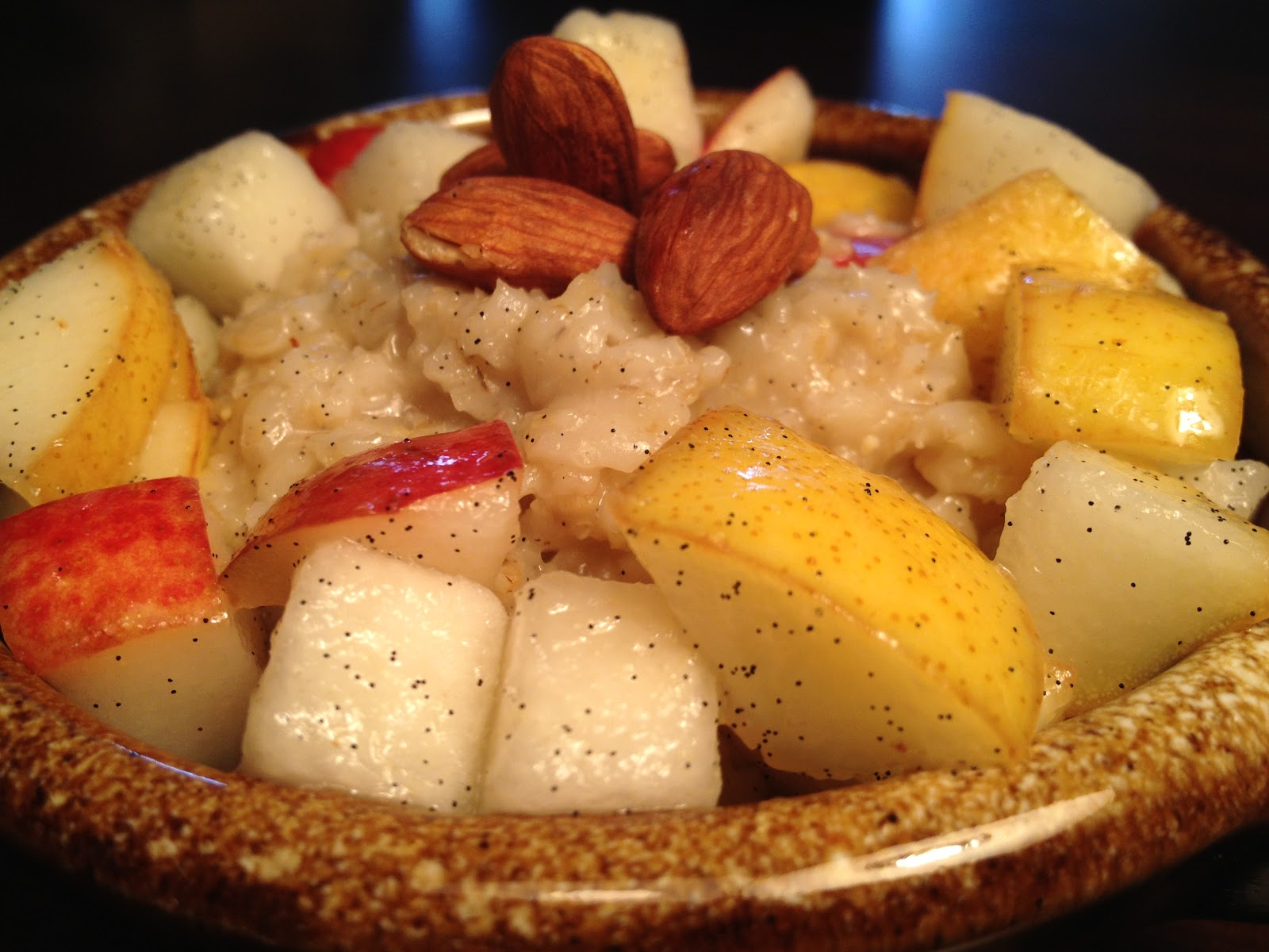Ingredients: Steel cut oats Ripe pear, cubed Toasted almonds Butter Honey Vanilla extract Fresh vanilla bean Cardamom