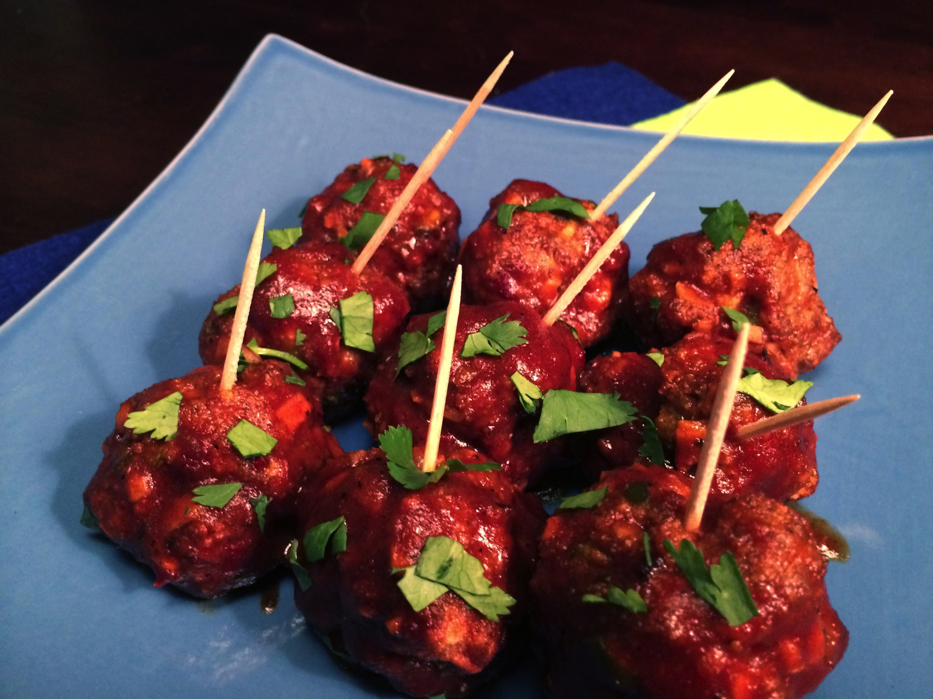 Sherman's Got Balls 1 lb. lean ground beef 1 egg 2 tbsp. half and half 1/2 cup bread crumbs 1/4 cup minced onion 1 seeded jalapeño, minced 1/2 tsp. cayenne 1/2 tsp. red pepper flakes 1/2 tsp. chili powder 1/2 tsp. salt 1/8 tsp. pepper Good BBQ sauce Preheat oven to 350˚. In a large bowl combine egg, water, bread crumbs, onion, jalapeños, and spices. Add ground beef and mix with your hands to combine. Form into 1" meatballs and place on a broiler pan. Bake for 25-30 minutes until meatballs are no longer pink in center. Toss in a BBQ of your choice and serve with toothpicks. Whoa, that's one spicy meatball!