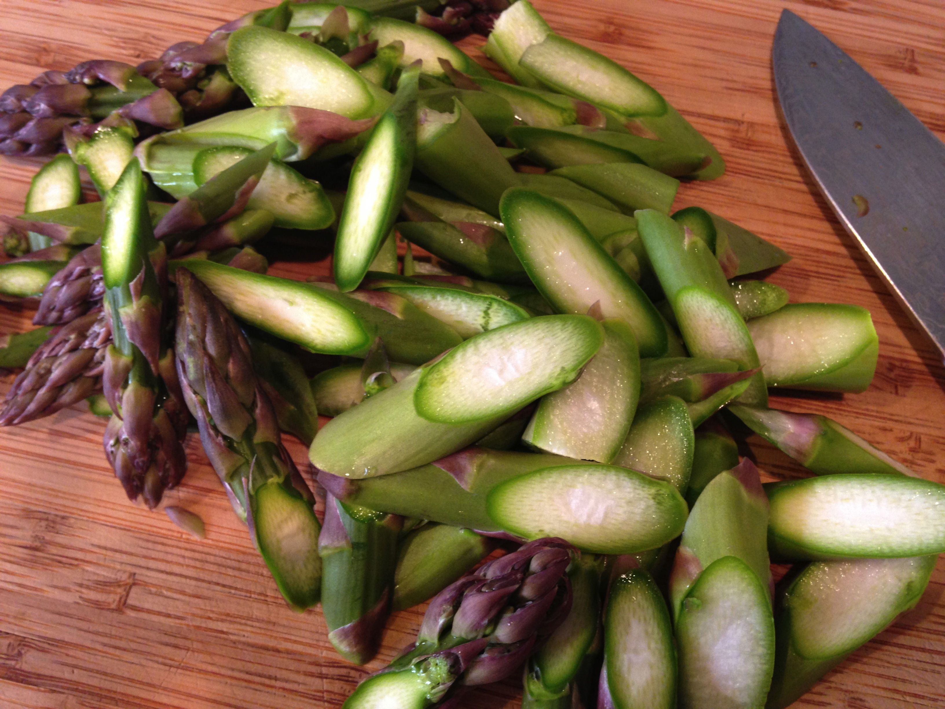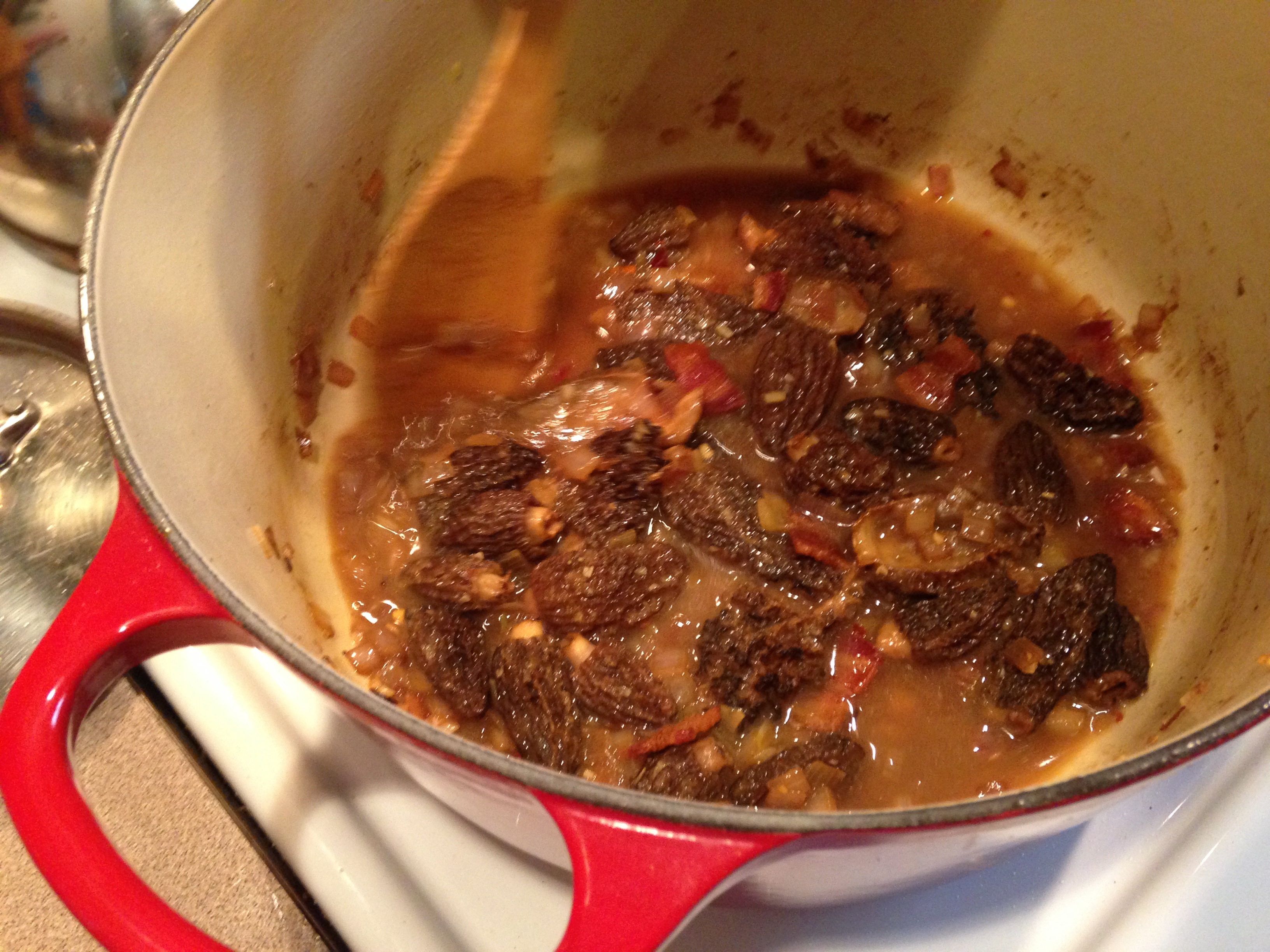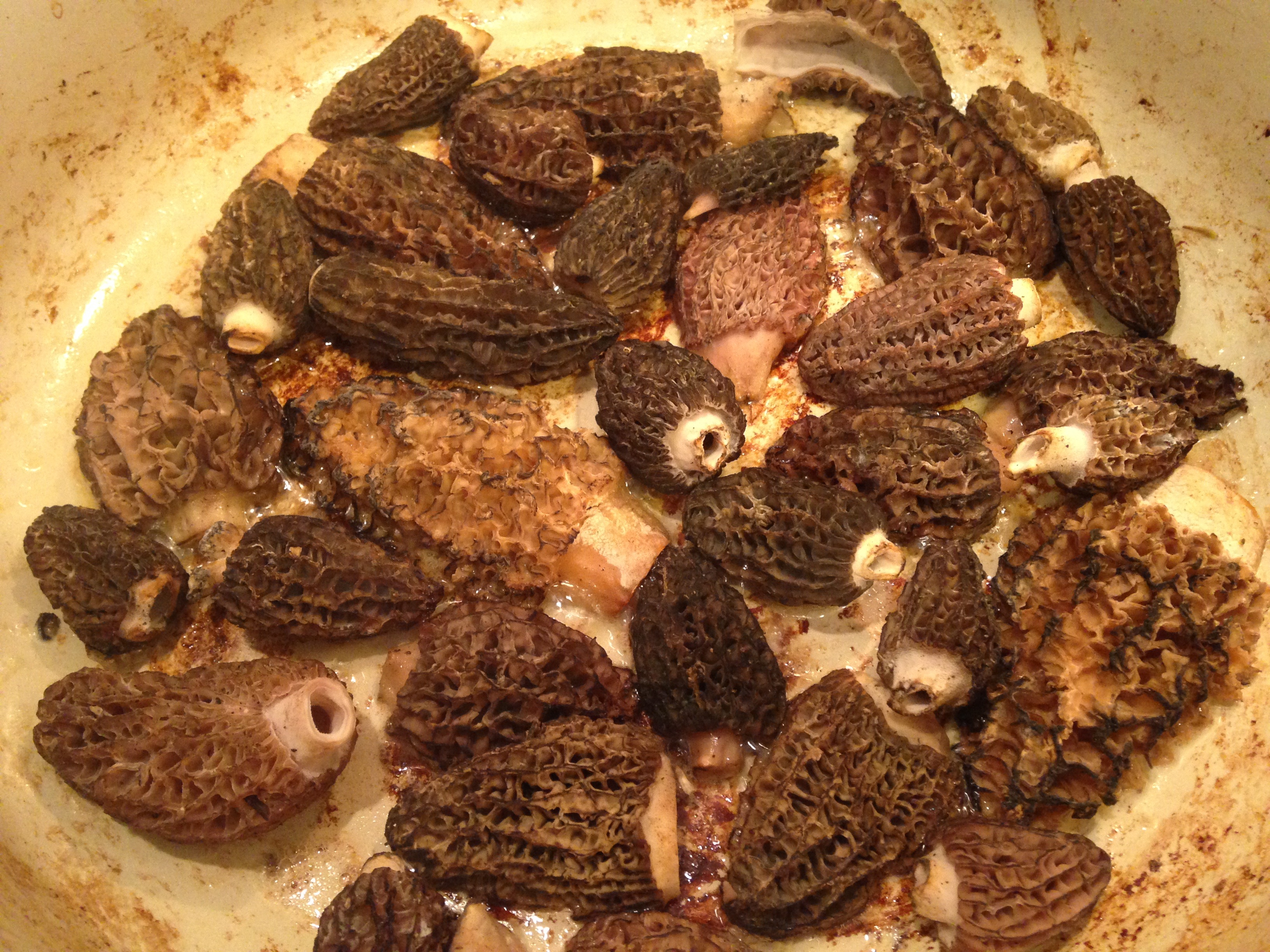 While at the store recently, I heard Elliott squeal with delight and found him drooling over an enormous basket of fresh morel mushrooms. They have long been his favorite fungus and since they have such a short season, when we see them, we know it's time to cast aside all diets and eat like royalty. This recipe is an ode to Elliott's time at the Palace Kitchen where every spring, morels would be served in a rich cream sauce over Martha's fresh pasta. Here, the asparagus, pancetta, and white wine are the perfect complements to the sweet, savory flavor of the morels. Ingredients: 1 lb. fusilli pasta 1/2 lb. fresh morel mushrooms, sliced in half 1/2 bunch of asparagus, cut on the bias 1 whole shallot, minced 2 cloves garlic, minced 2 slices bacon, roughly chopped 6 slices pancetta 3/4 cup heavy cream 1/2 cup unoaked chardonnay wine Parmesan, or other hard cheese, shaved (we used "Old Goat" cheese)