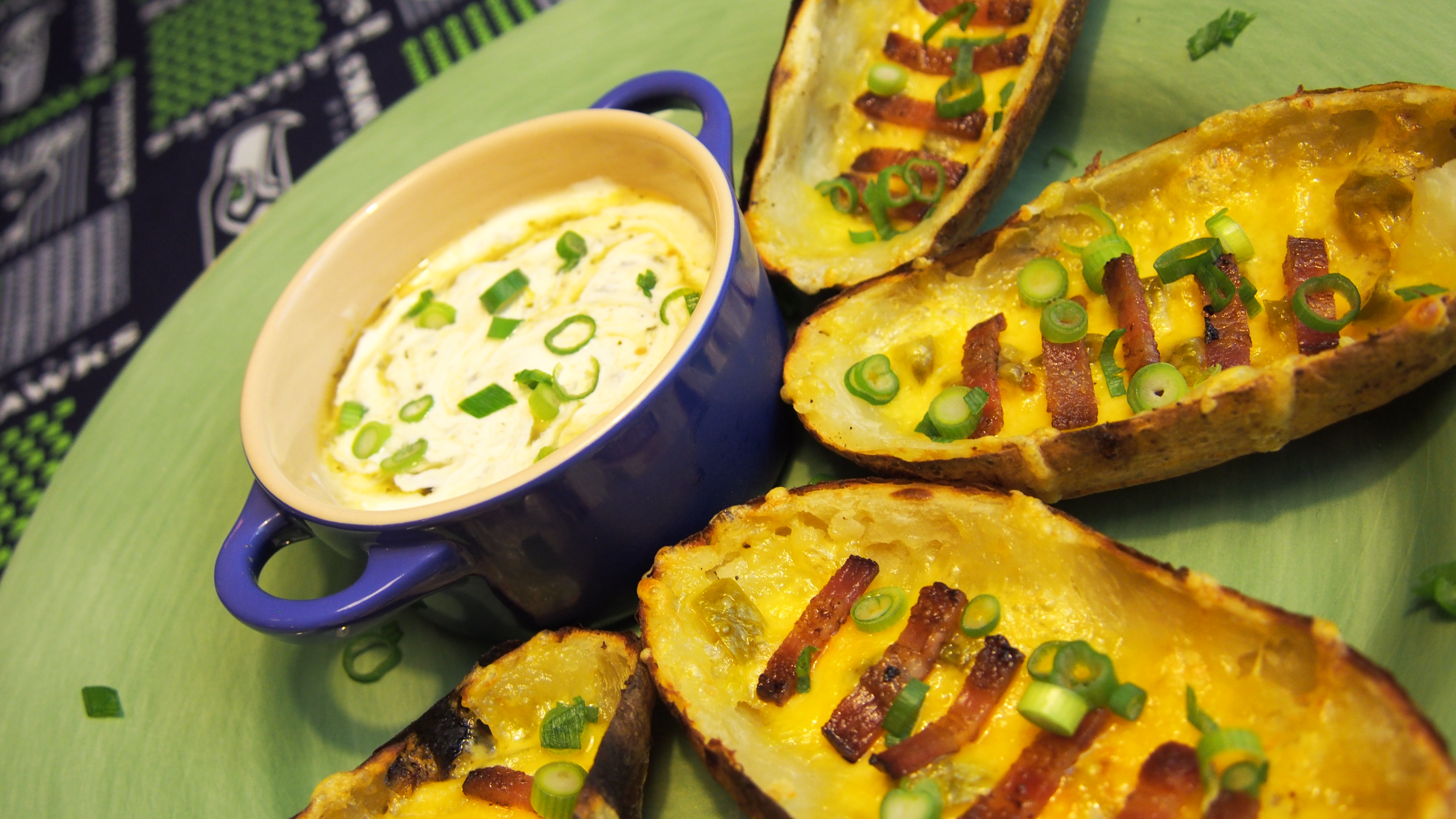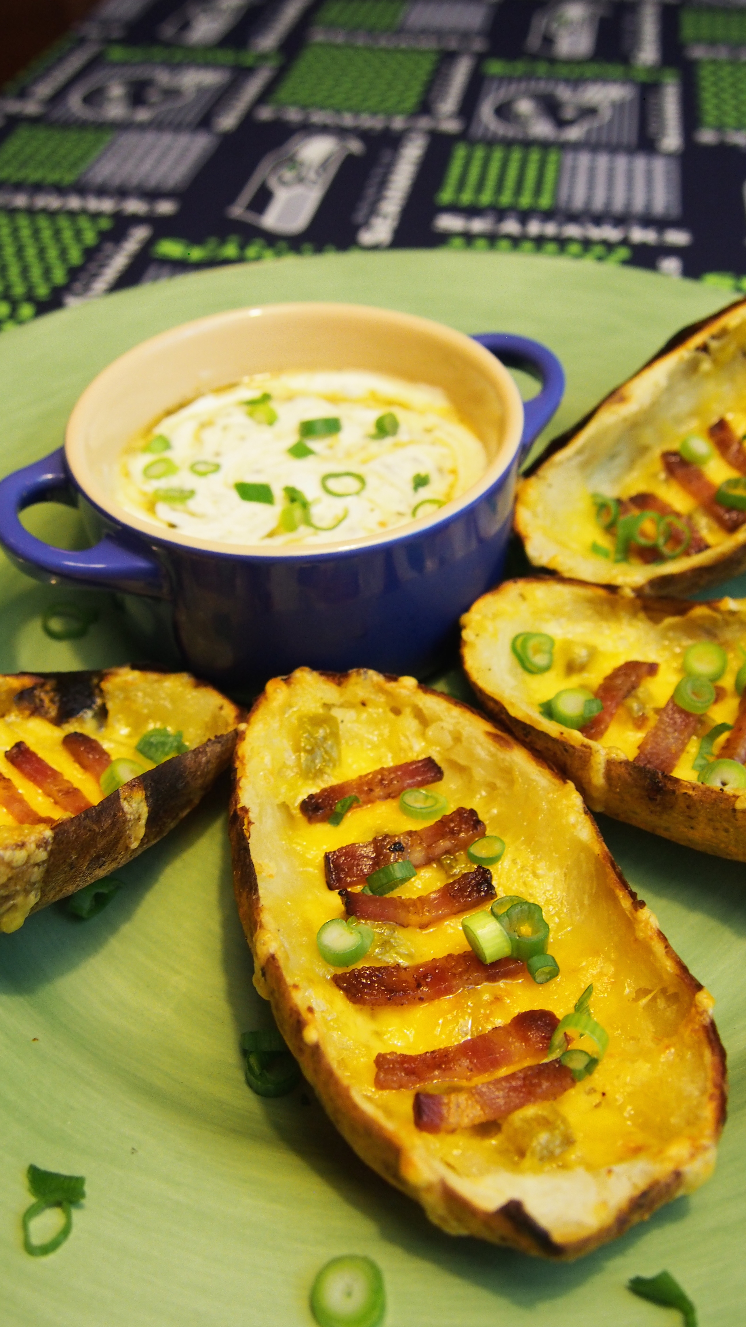 The Seahawks are back in the Superbowl so we couldn't resist another football themed appetizer. A local chef already capitalized on the Skittle frenzy with this rainbow flavored sausage, so we had to get creative. What better inspiration than Deflategate? With bacon laces and a hidden layer of pickled jalapeños, these pigskins are the perfect fuel for those hungry fans. Ingredients: 4-12 russet potatoes (1 potato per guest) 3-4 slices thick-cut bacon Medium cheddar cheese, grated 1 can nacho jalapeños, diced Green onion, sliced Sour cream Salsa verde, to taste Rub the potatoes with olive oil, salt, and pepper and bake in a 400˚ oven for 1 hour. Once the potatoes are cool enough to handle, cut in half lengthwise and scoop out 2/3 of the flesh. Meanwhile, bake the bacon at 350˚ until crispy and cut into strips while still warm. Set the potato halves on a baking sheet and sprinkle with some of the diced jalapeño. Top with grated cheddar and broil on high until melted and beginning to brown. Lay the bacon strips on top and serve with green onion, black olives, and the sour cream-salsa verde mixture. Go Hawks!