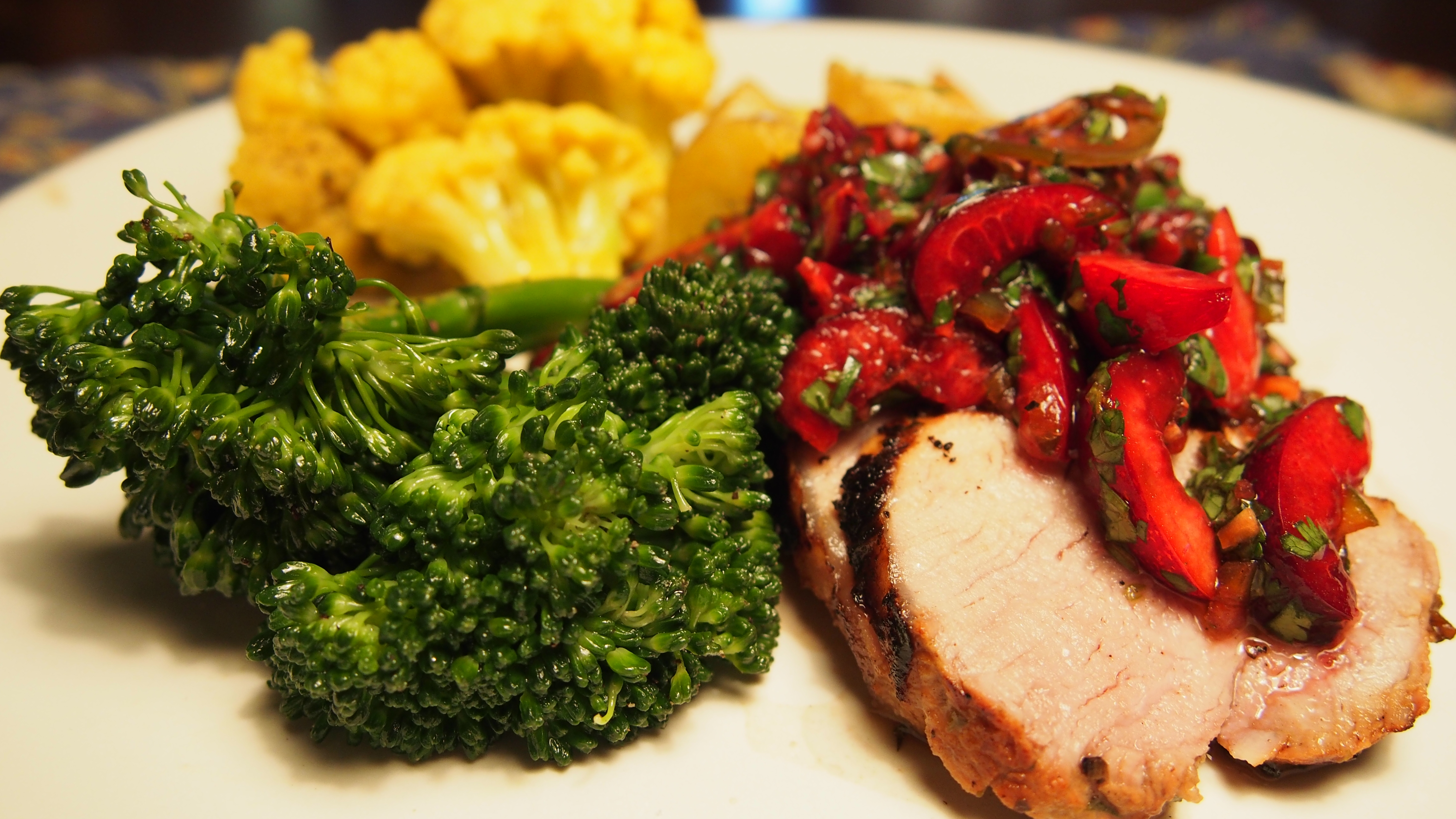 For my birthday this year, my dad gave me a bag full of cherries that he and his wife, Joanne, picked that morning from their orchard up on Whidbey Island. Making a cherry dessert was a given for us but we also wanted to find a way to use them in our dinner as well. After a quick Google search for "pork" and "cherries," we ran across this recipe: Grilled Pork with Cherry Salsa. We made a few minor adjustments, such as adding lemon zest to the marinade and using green jalepeños instead of red, but overall, this recipe was too good to not share. We had never had a cherry salsa before and were completely floored by its complexity. Take advantage of cherry season and try this recipe!
