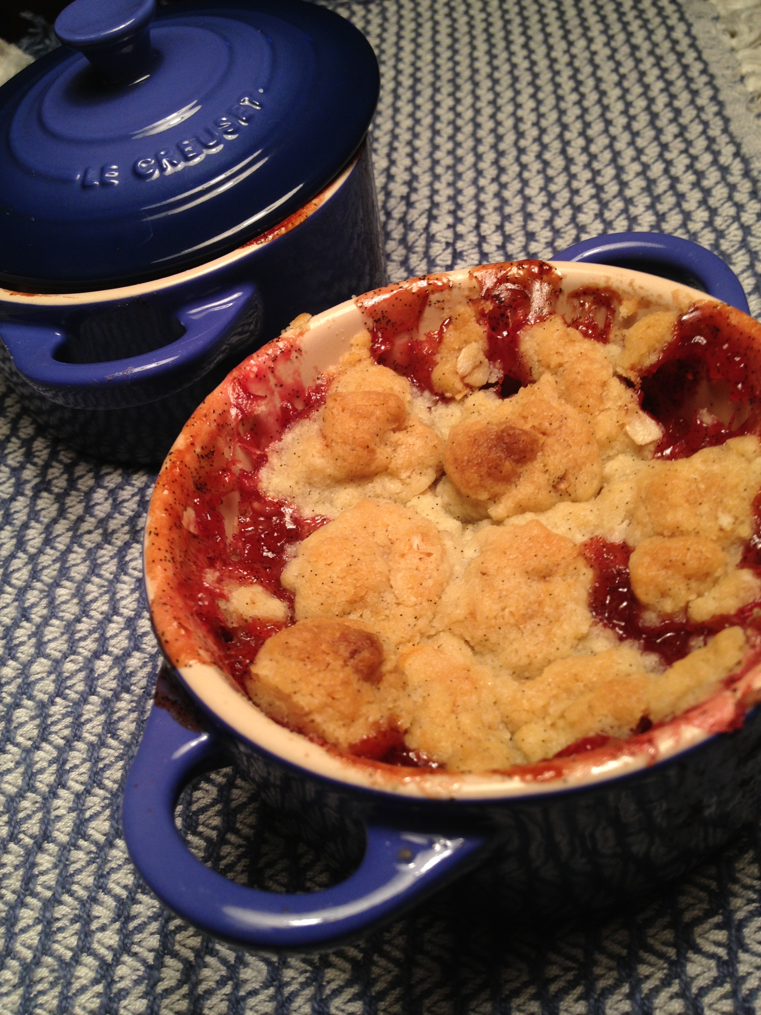 Since we had some fresh raspberries on hand, we also decided to make a raspberry-ginger spritzer and an apple-raspberry crumble. We drink a ton of soda water around here, so we finally took the plunge a couple of months ago and purchased a Soda Stream. We weren't sure if it was going to be cost effective or functional, but our doubts have been completely erased - It's super easy to use and the smaller canisters can carbonate a bottle-a-day for several months. We've gotten to be pretty creative making our own concoctions: Spritzer: 1-1/2 cup filtered water 1/4 cup sugar 2-3 inch piece of ginger, peeled and sliced thin 1/2 vanilla bean 1/4 cup raspberries, mashed 1/2 lemon, juiced Essentially, this is an infused simple syrup. In a pan, bring all of the ingredients to a boil and simmer for 10-20 minutes. Strain the mixture and cool until serving. Mix with sparkling water at whatever concentration you prefer (a huge part of why we love the Soda Stream is that we can make beverages that aren't as SWEET as regular soda). For Elliott's birthday last year, Carinn got two matching Le Creuset mini cocotte dishes; They're perfect for making quick, single serve crumbles: Filling: 1 fugi apple 1/4 cup raspberries 1 tbsp. sugar 1 vanilla bean, scraped 1/4 lemon, juiced 2 tsp. quick tapioca Streusel Topping 4 tbsp. stick butter 2 tsp. light brown sugar 1/4 cup flour Dice the apple then toss the remaining ingredients together and let stand for a few minutes. Don't worry, the raspberries aren't going to hold up to the heat anyhow, so its okay if they disintegrate when mixing. For the crumble, place the butter in the freezer for fifteen minutes and toss the sugar and flour together with a fork. Chop the butter into small, 1/4" cubes and toss with the flour and sugar until they're loosely incorporated. You should end up with a clumpy pile of streusel pieces to pile on top of the filling in the mini cocottes. Bake in a 400° oven for 35-45 minutes, or until the topping is browned and the filling is bubbling up. Elliott likes to time this recipe by smell. After 20 minutes or so, our small apartment begins to smell like delicious fruit and vanilla. After 35 minutes or so, an additional nutty, brown-butter smell begins to emanate from the oven. That's when we know that the topping is perfectly finished and the insides are heated through. Cool for at least 10 minutes.
