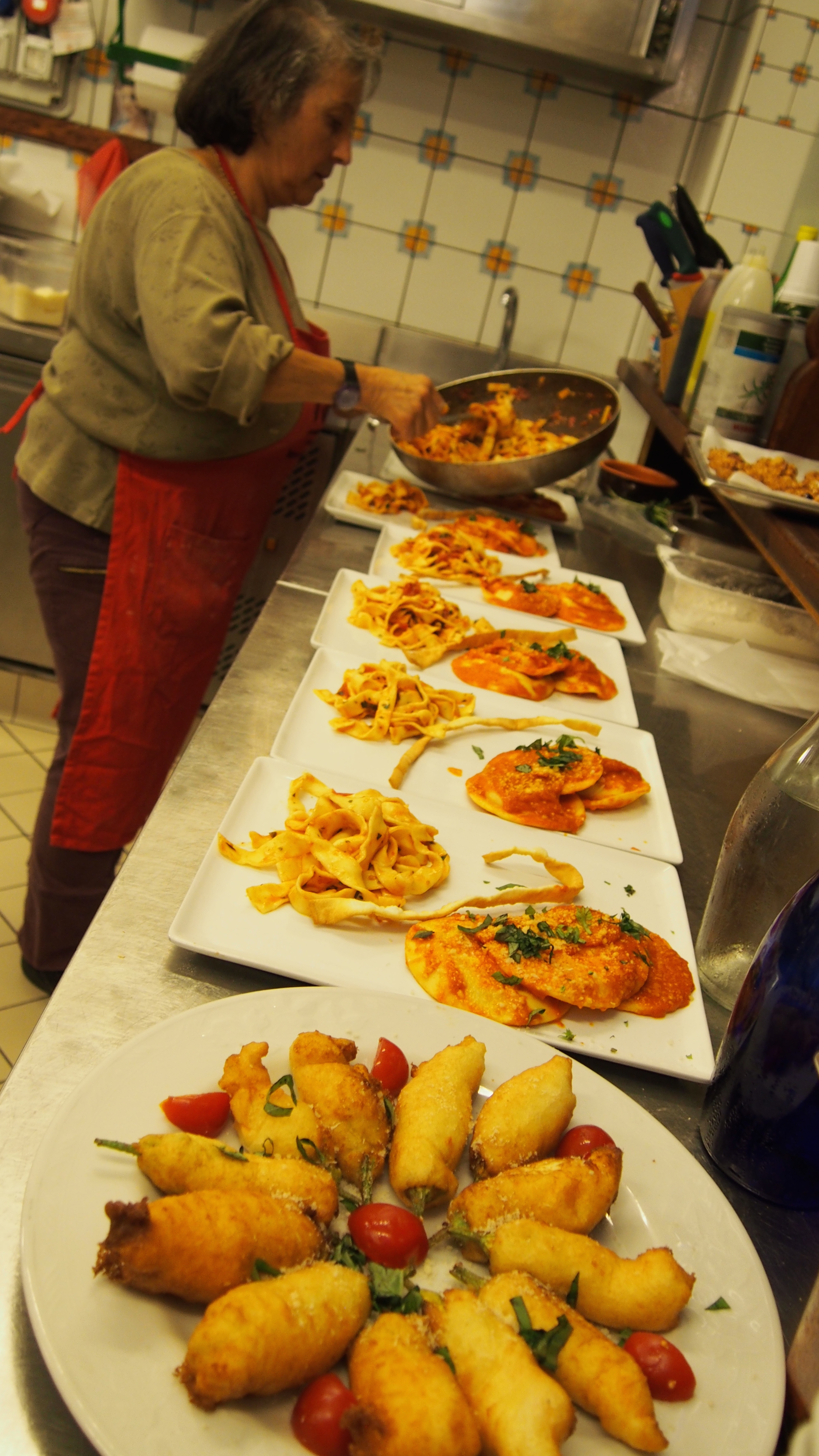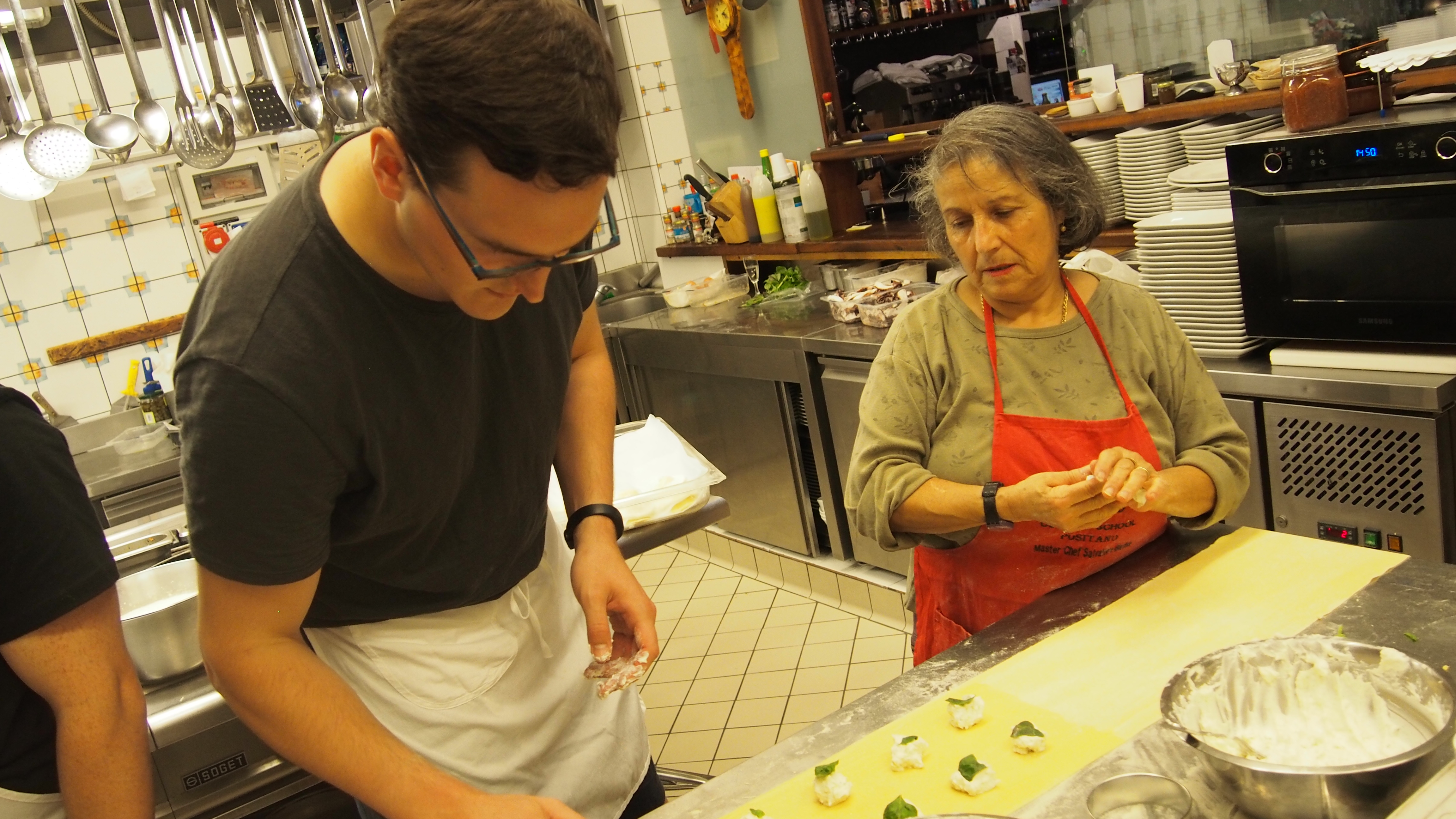 Our 5 hour cooking class started at 3pm and ran all the way into dinnertime, the perfect antidote to our rainy predicament. Along with two honeymooners from Canada and two girlfriends on a workcation (they call their far-flung adventures together 'mini-moons'), we learned how to make stuffed zucchini flowers, fresh ravioli with four kinds of cheese, fish with white wine, and steak with balsamic vinegar (though the class thought that 'scalloped meat' was really scallops). For dessert we made delicate almond cookies that could be topped with candied cherries, chocolate or white sugar sprinkles. Delicious!